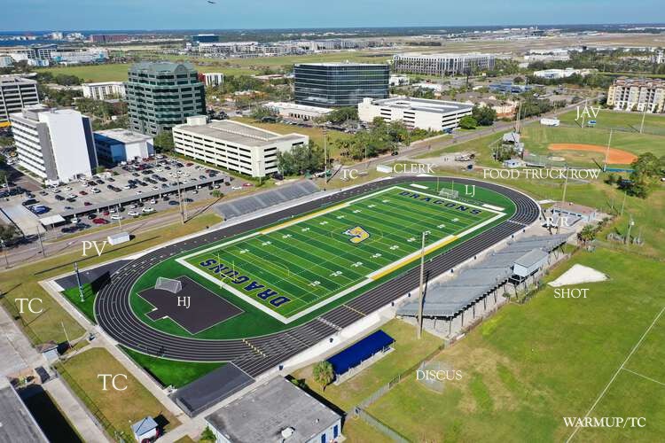 Team tents will be allowed in the stadium only on the top row of the grandstand and on the grass surface around the track "BUT" must be 2 FEET back from the sidewalk. All space will be available on a FIRST COME BASIS starting at 5pm on Friday May 22nd. Tents are not allowed in any other area of the stadium or outside of the stadium.